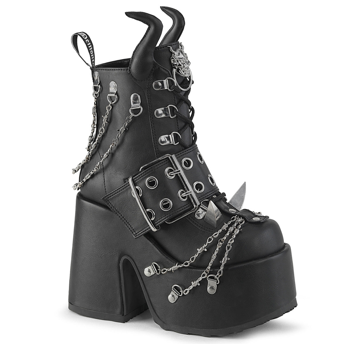 Black Faux Leather D-Ring Lace-Up Front Ankle Boots with Devil Horns, Double Grommet Buckle Straps, Claw Spike Studs, Hanging Barbed Wire Chains, a Metal Devil with Bullhorn on the Tongue and a Metal Zipper on the Inner Side