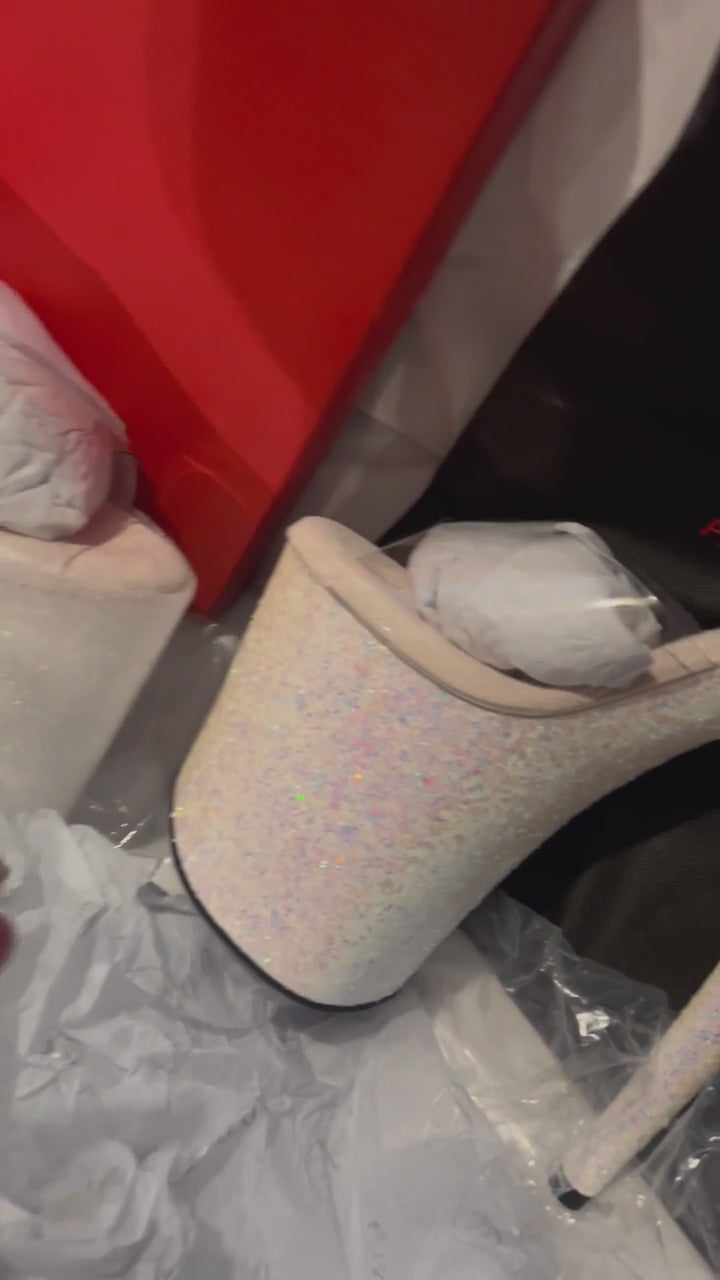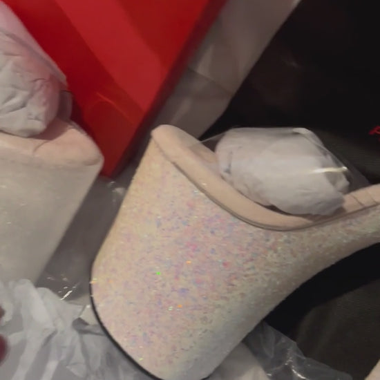 Clear Ankle Strap Sandals with Opal Insoles and a Multi-Coloured Opal Glitter Covered Platform Bottom