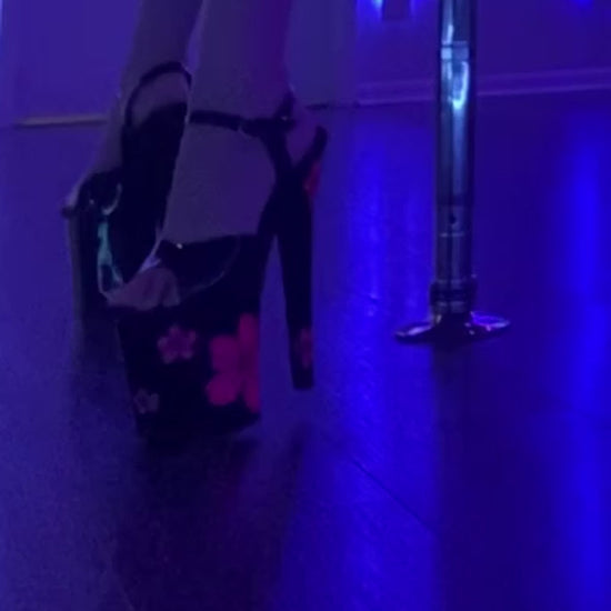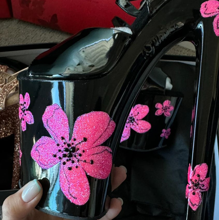 Black Patent Ankle Strap Sandal with Black Insoles and UV-Reactive Hot Pink Glitter Hibiscus Flowers 🌺 Printed on the Black Platform Bottom
