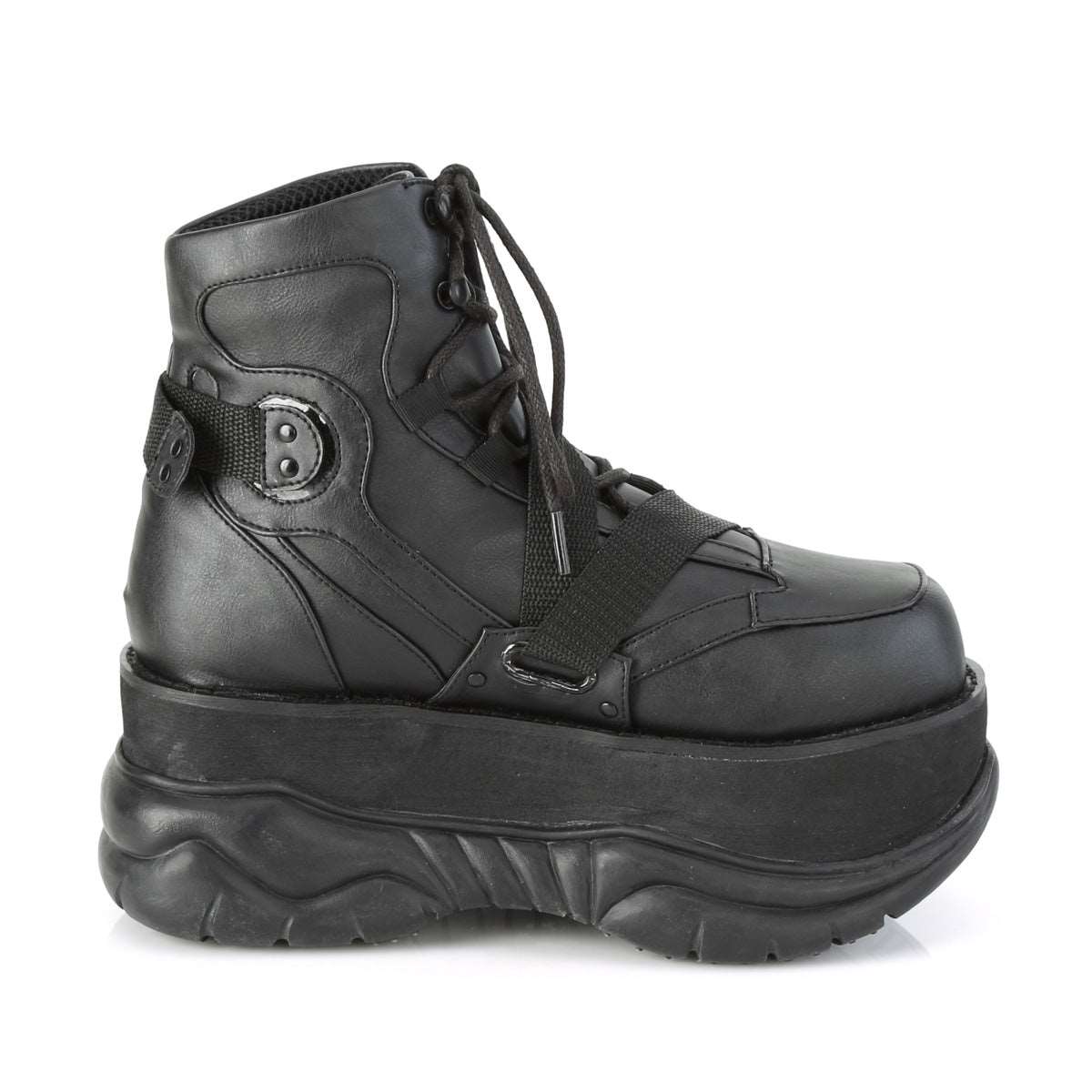 Black Faux Leather Lace-Up Front Platform Ankle Boots with Zig-Zag Straps with Quick Release Plastic Buckles