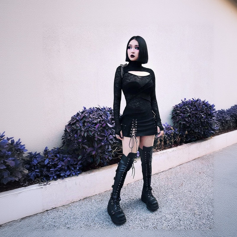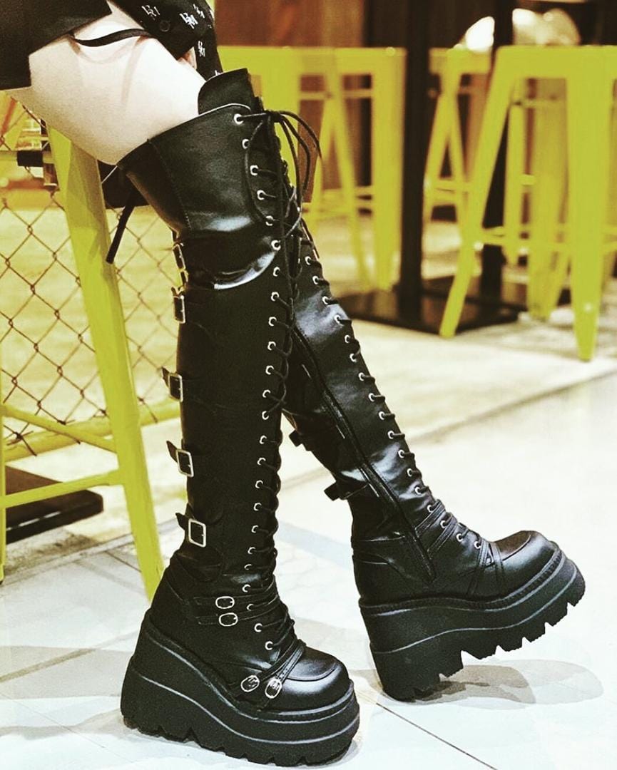 Black Stretch Faux Leather Wedge Platform Lace-Up Front Over-The-Knee Boots with 4 Small Buckled Straps at the Ankle and Vamp, a Back Stretch Panel with 5 Buckled Straps and a Full-Length Inner Side Zipper