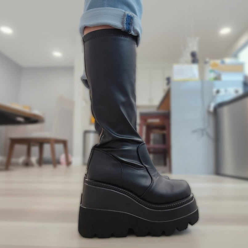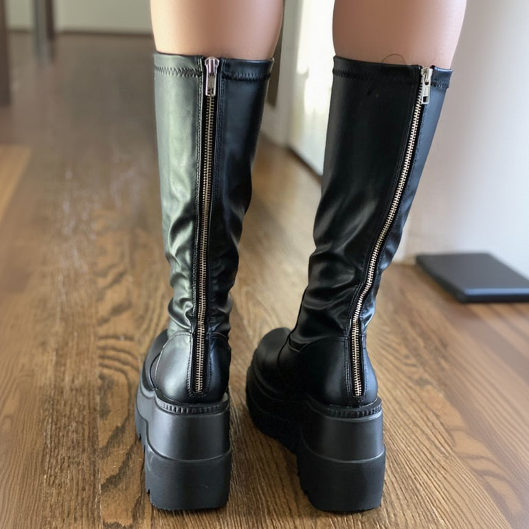 Black Stretch Faux Leather Knee-High Wedge Platform Boots with a Full-Length Metal Back Zipper