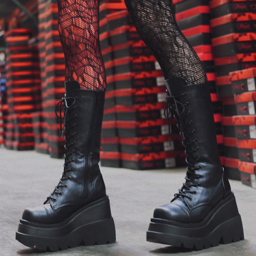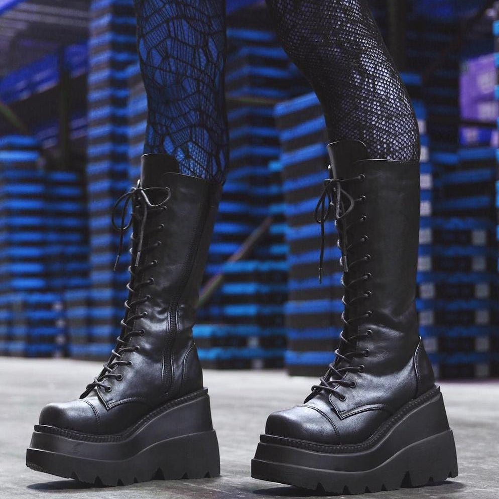 Black Faux Leather Lace-Up Front Mid-Calf Wedge Platform Boots with a Full-Length Inner Side Zipper