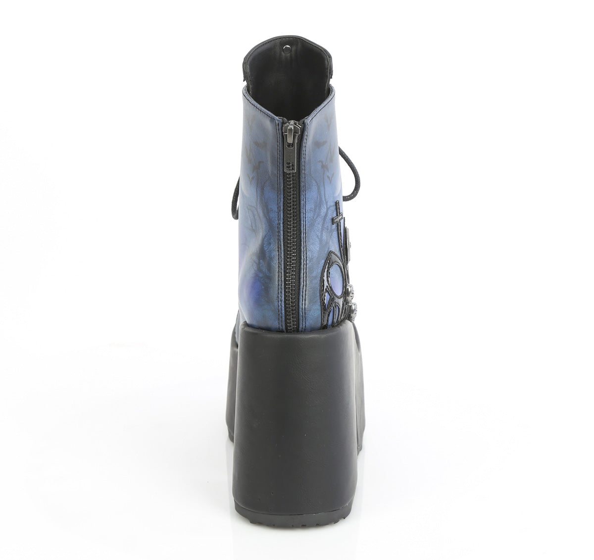 Matzwarte D-ring veter-enkellaarsjes met een blauw-paarse Moonlit Gothic-print aan de binnen- en buitenzijde, opgestikte zwarte lakleren kathedralen, kleine bedel-details en doodshoofdjes aan de buitenzijde een ritssluiting aan de achterzijde