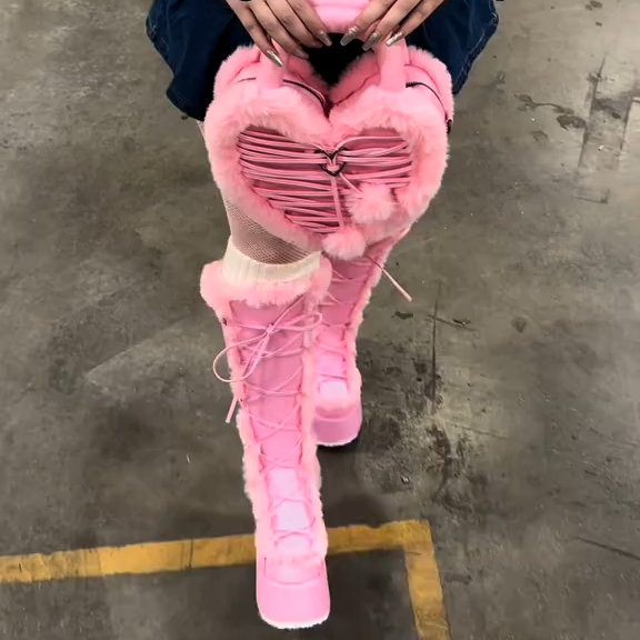 Lichtroze hart-vormige handtas met een afneembare schouder-band, imitatie-bont randen, aan de voorzijde van de tas korset-stijl veterwerk met imitatiebont pompons aan het einde en een hartjes-ring in het midden, een rits-zakje aan de binnenzijde en een metalen ritssluiting aan de bovenzijde