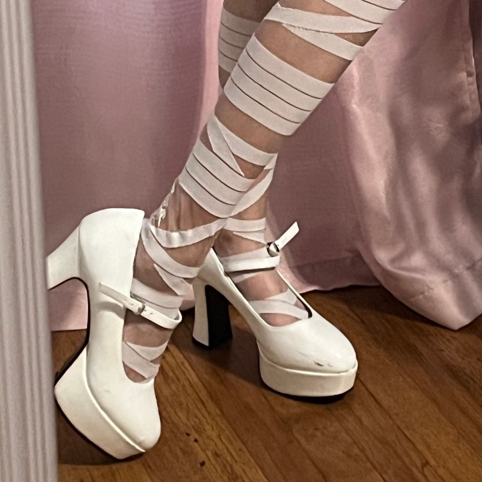 White Patent Mary Jane Pumps with a Square Heel and Platform