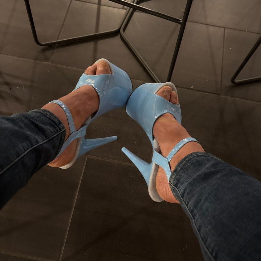 Baby Blue Patent Ankle Strap Sandals with Baby Blue Insoles and a Baby Blue Platform Bottom