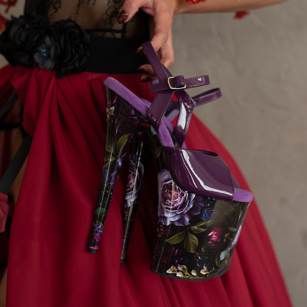 Diepviolette bloemen ontvouwen zich tegen een duistere achtergrond en vertellen een verhaal van schoonheid, mysterie en kracht. Gemaakt voor dansers die het podium beheersen met stille zelfverzekerdheid en magnetische allure — Midnight Florals verandert je heels in een waar midnight masterpiece.