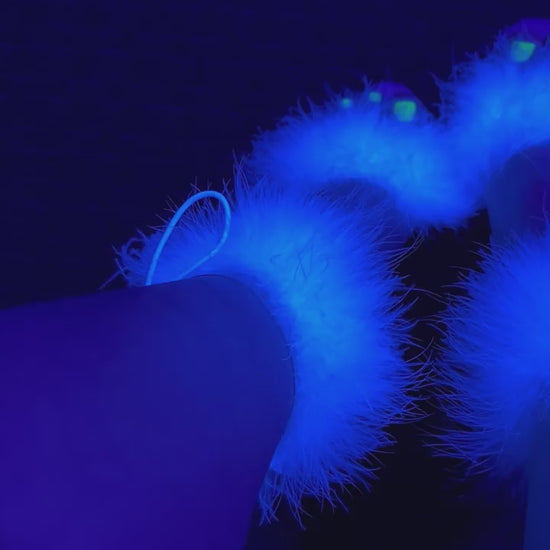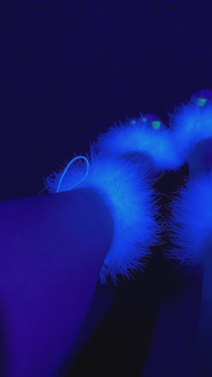 Clear Close Back Ankle Cuff Sandal with Side Lacing, White Marabou Fur on the Vamp, the Ankle Cuff and in the Platform Bottom and a Back Zipper
