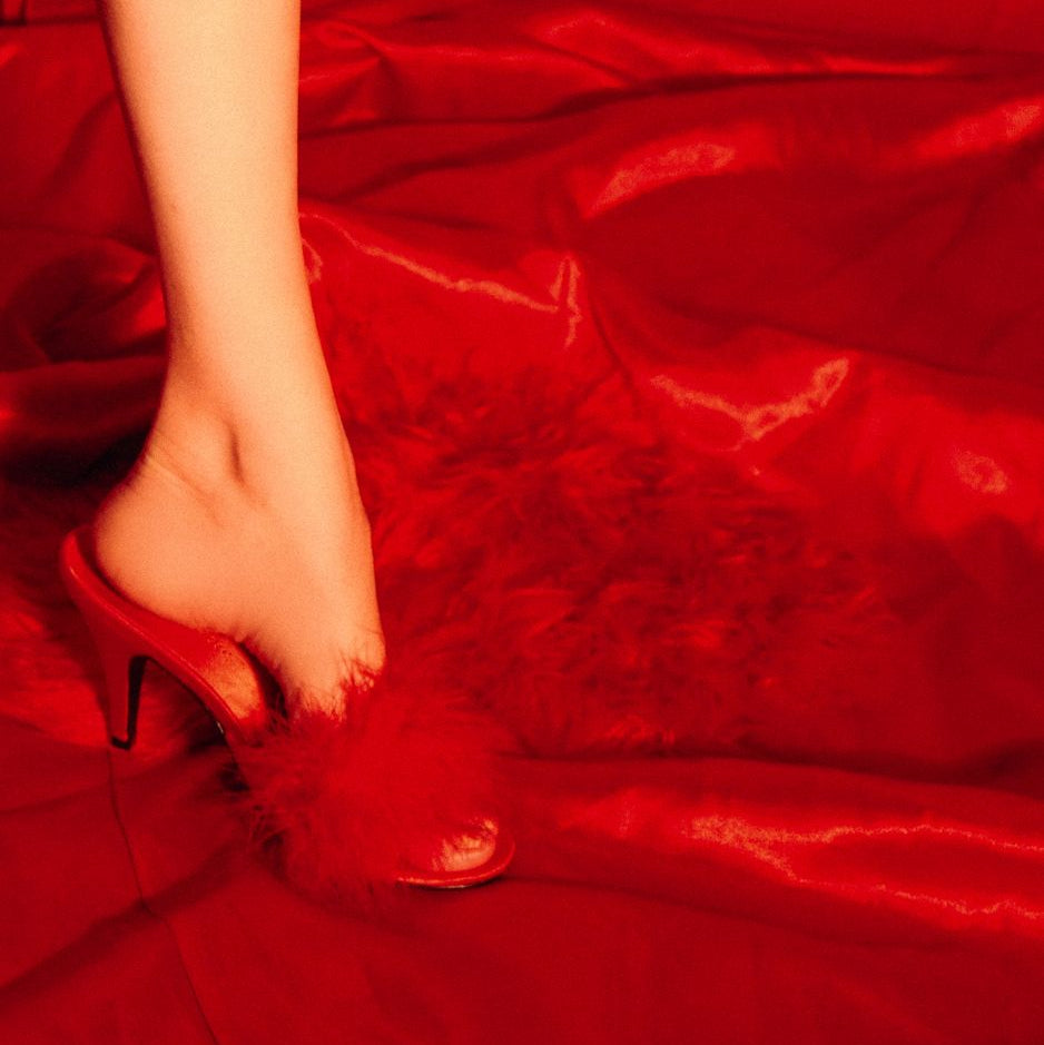 Rode muiltjes met Maraboe veren op de voorvoet en een rood satijnen voetbed en hak