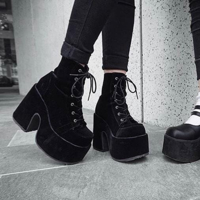 Black Velvet Lace-Up Front Ankle Boots with a Metal Back Zipper