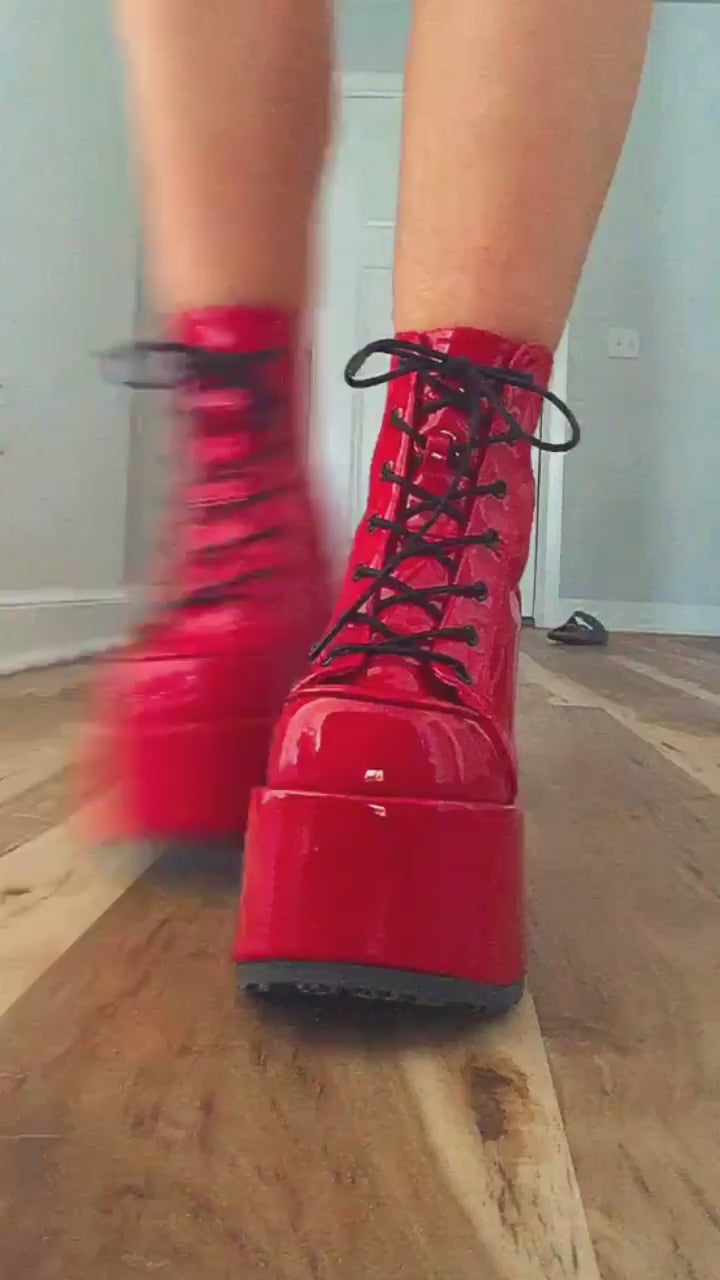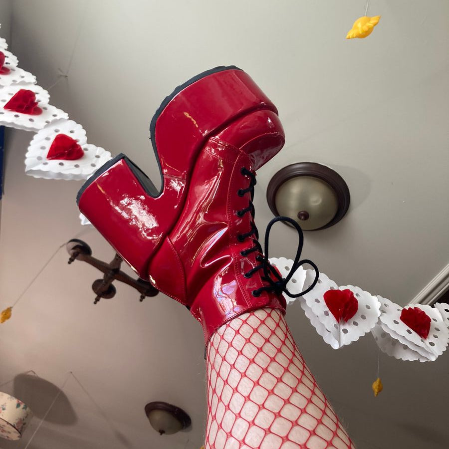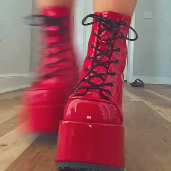Red Patent Lace-Up Front Ankle Boots with contrasting Black Laces, Black Outsoles and a Black Back Zipper