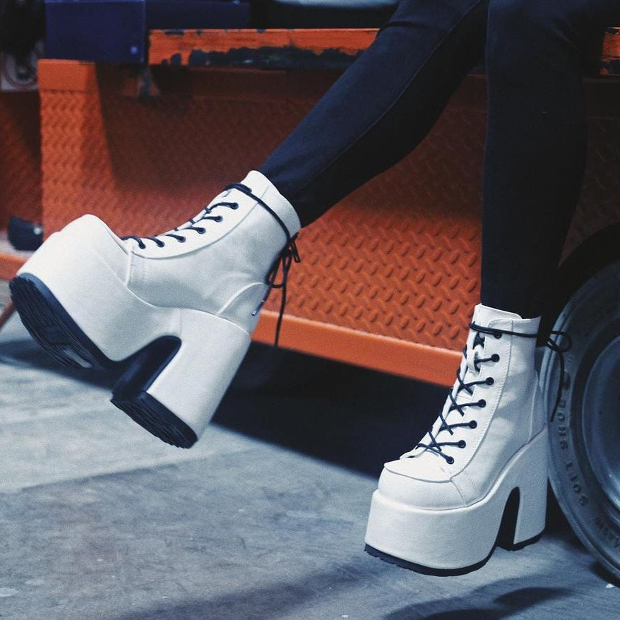 White Faux Leather Lace-Up Front Ankle Boots with Contrasting Black Laces, Black Outsoles and a Black Back Zipper