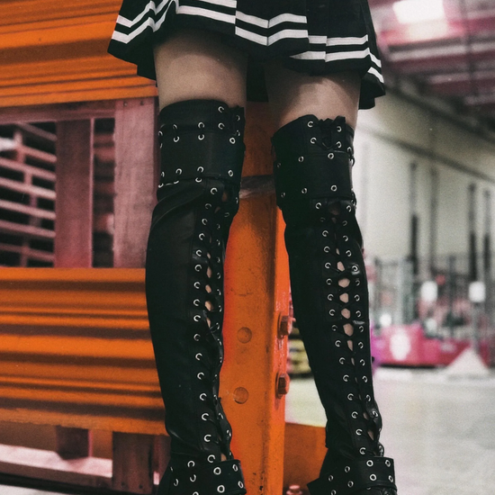 Black Stretch Faux Leather Lace-Up Front Thigh-High Wedge Platform Boots with an Open Front, Hook-N-Loop Straps at the Top and at the Instep and a Full-Length Inner Side Zipper