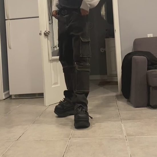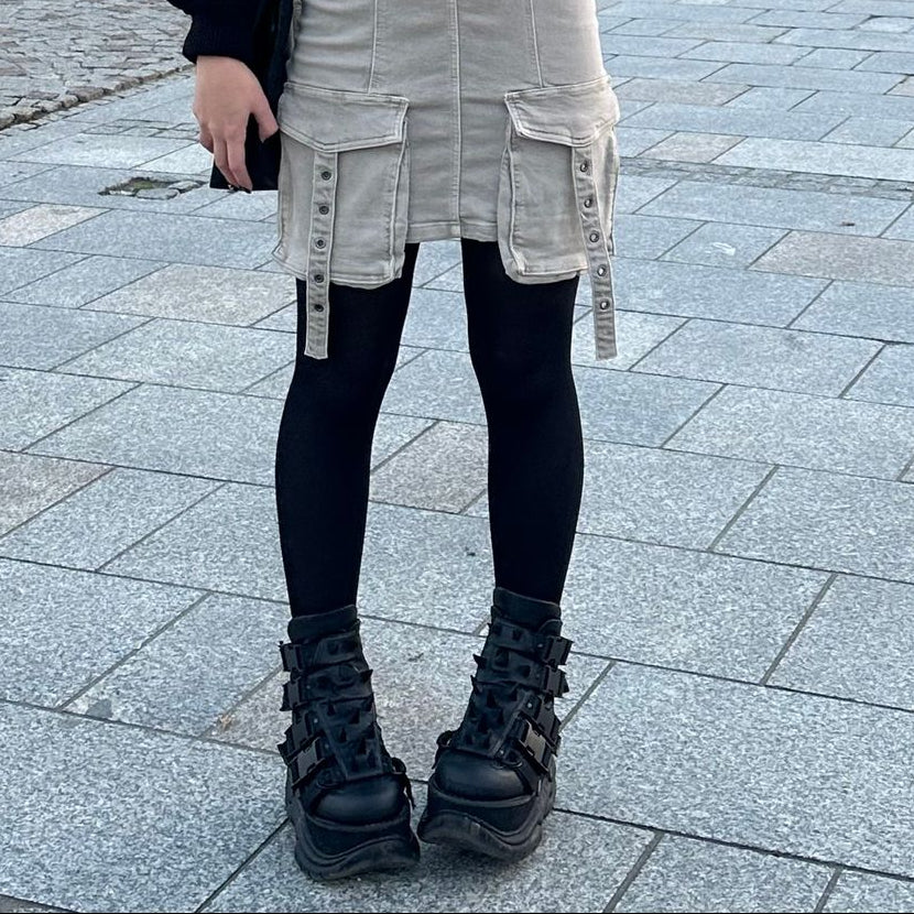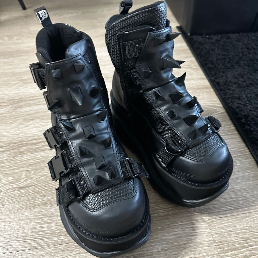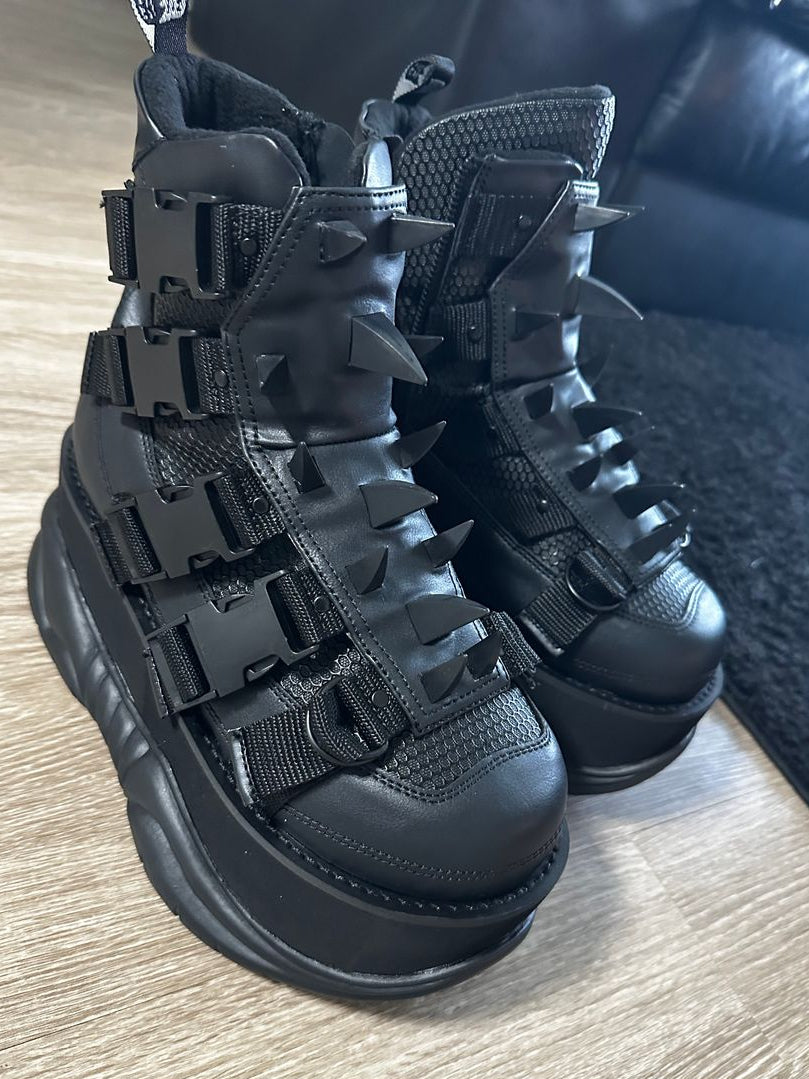 Matzwarte plateau-enkellaarsjes versierd met een doodskist-vormig schild met rubberen klauw-spikes met quick release plastic gespen aan de bovenzijde van de laars