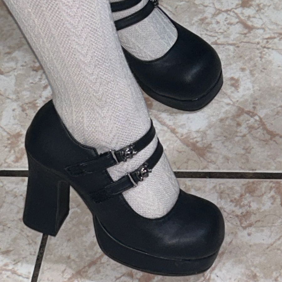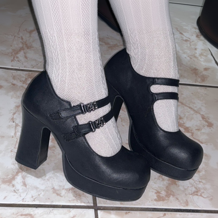 Matzwarte Gothic Lolita Mary-Jane pumps met een blokhak, lichtroze binnenvoering en doodshoofd-gespen