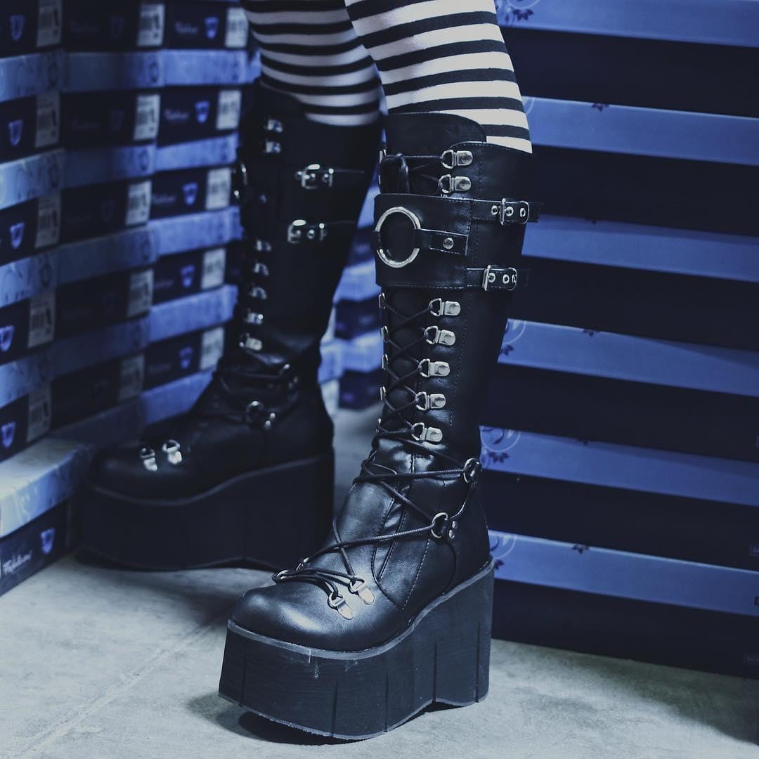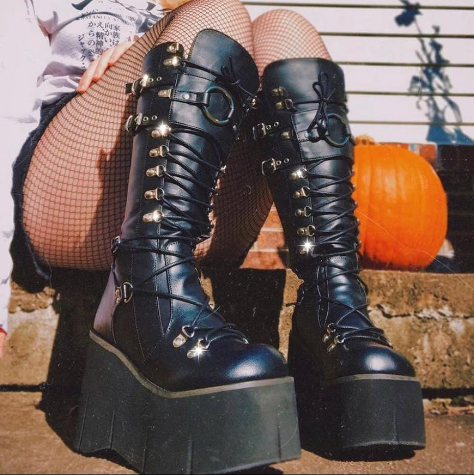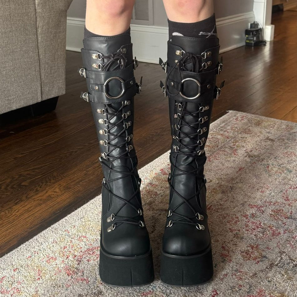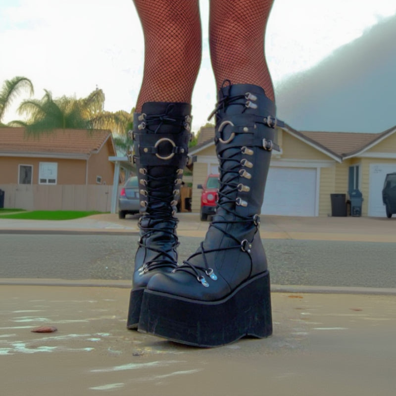 Black Faux Leather D-Ring Lace-Up Front Knee-High Wedge Platform Boots with Adjustable Front Shield with Oversized O-Ring and a Full-Length Metal Back Zip