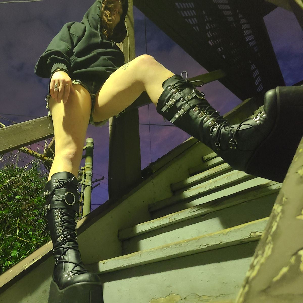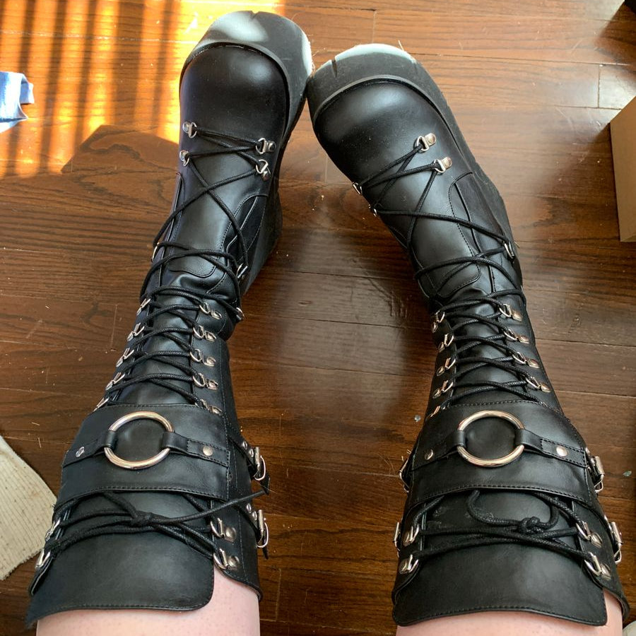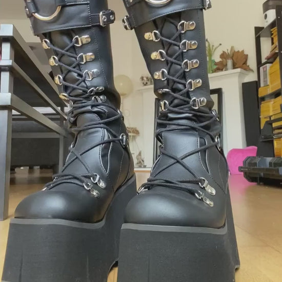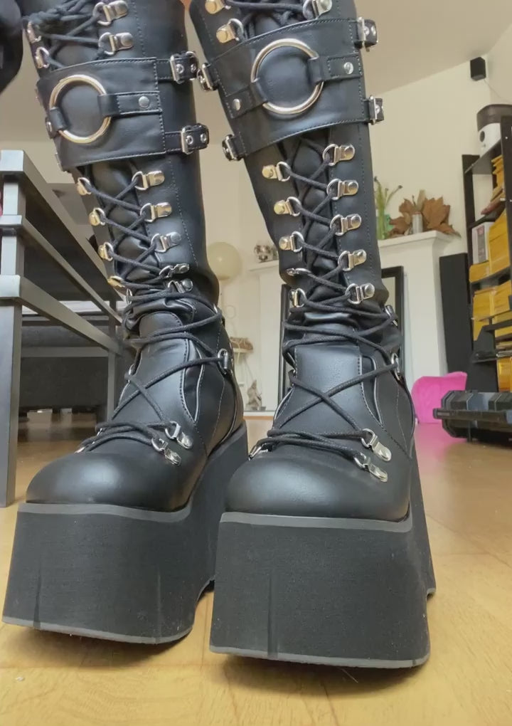 Matzwarte D-ring sleehak plateau veter-knielaarzen met een verstelbaar schild met gespriempjes aan de voorzijde, een overdreven grote O-ring op het schild en een ritssluiting aan de achterzijde