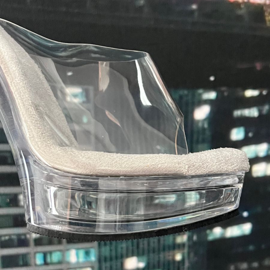 Transparante peep toe muiltjes met een wit voetbed en een transparante plateauzool en hak
