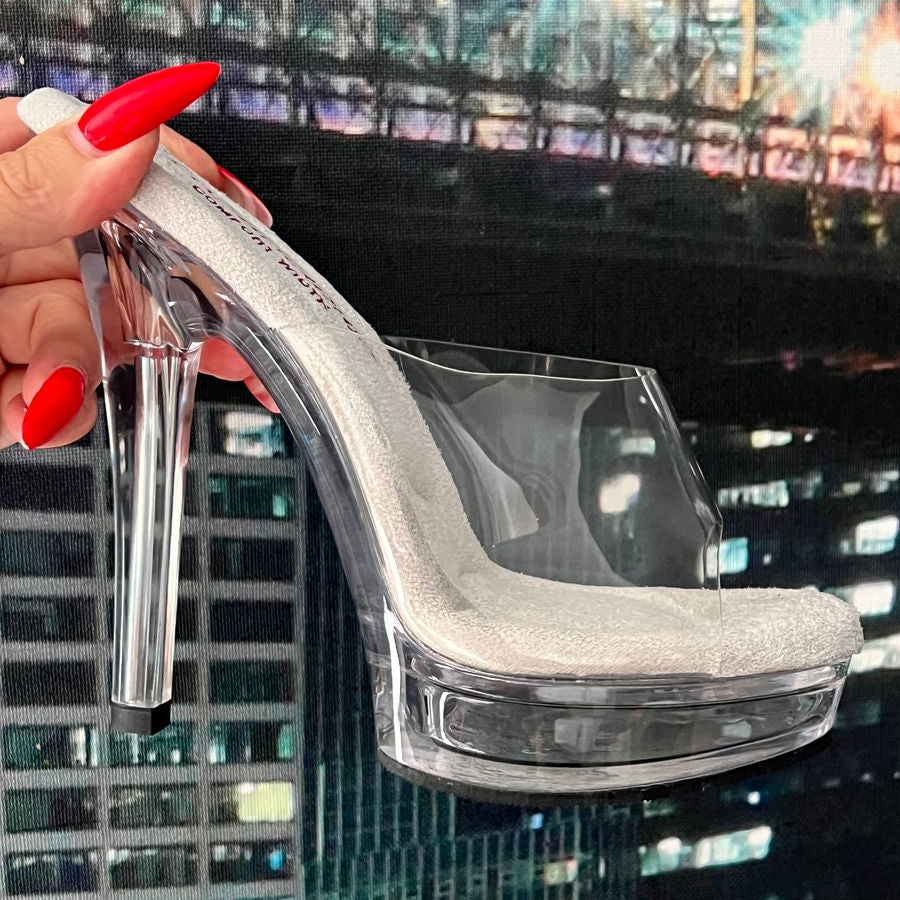 Clear Comfort Width Peep Toe Slides/Mules with White Insoles and a Clear Platform Bottom and Heel