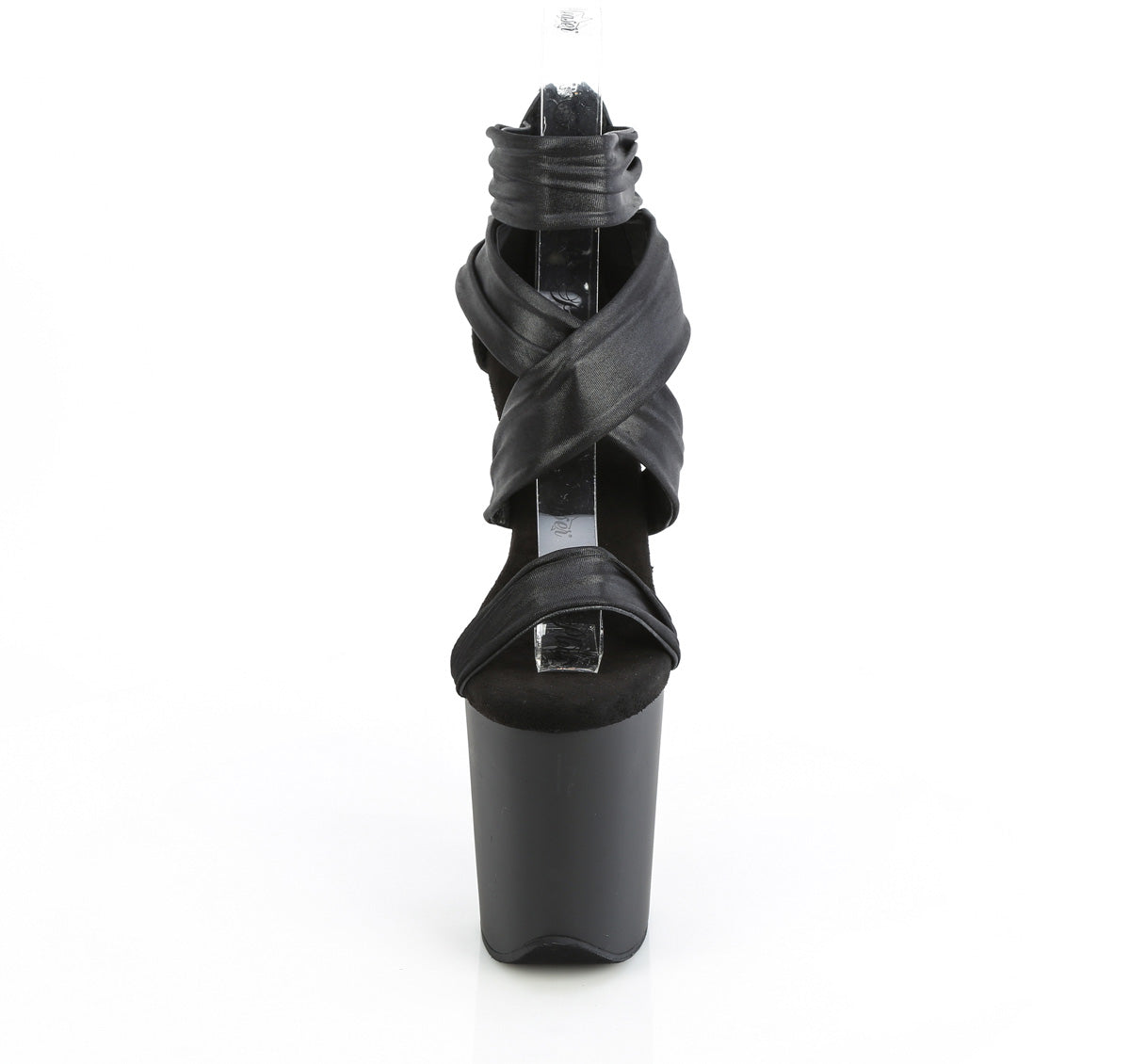 Matzwarte sandalen met een gesloten hiel, gekruiste banden van gerimpeld stof, een matzwarte plateauzool en een ritssluiting aan de achterzijde