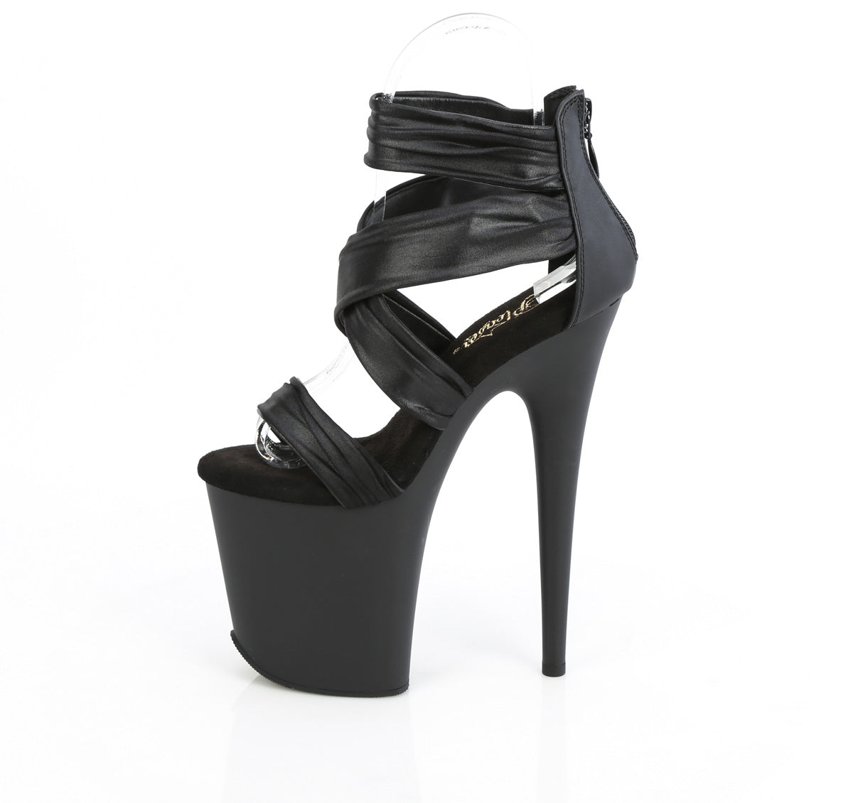 Black Faux Leather Close Back Ankle Strap Sandals with Black Matte Platform Bottom with Ruched Fabric Straps and a Back Zipper