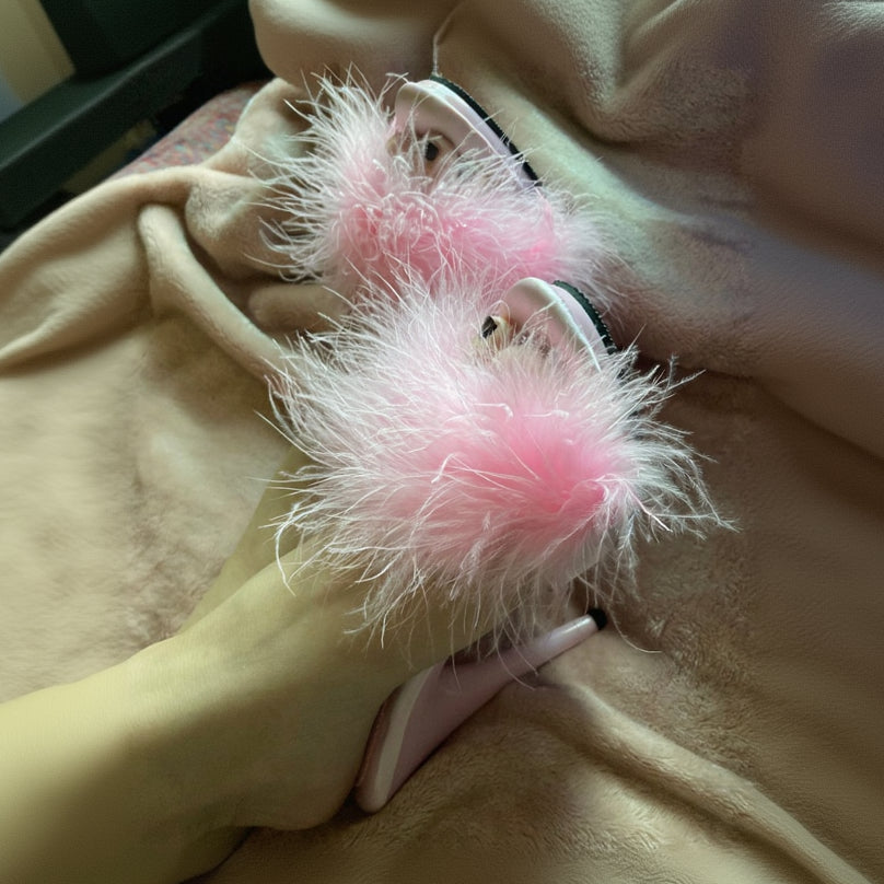 Baby Pink Satin Peep Toe Slides/Mules with Baby Pink Satin Insoles and Baby Pink Marabou Fur on the Vamp
