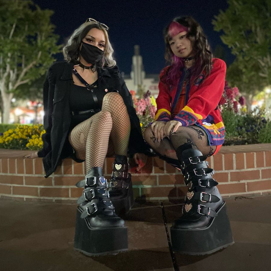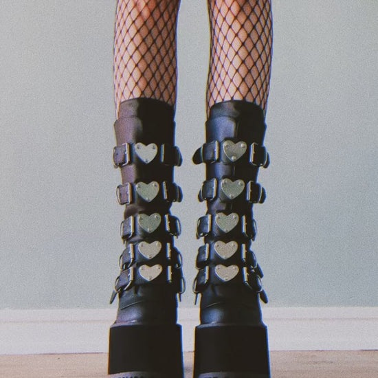 Black Faux Leather Mid-Calf Wedge Platform Boots with 5 Buckled Straps with Heart-Shaped Metal Plates at the Center and a Metal Back Zipper