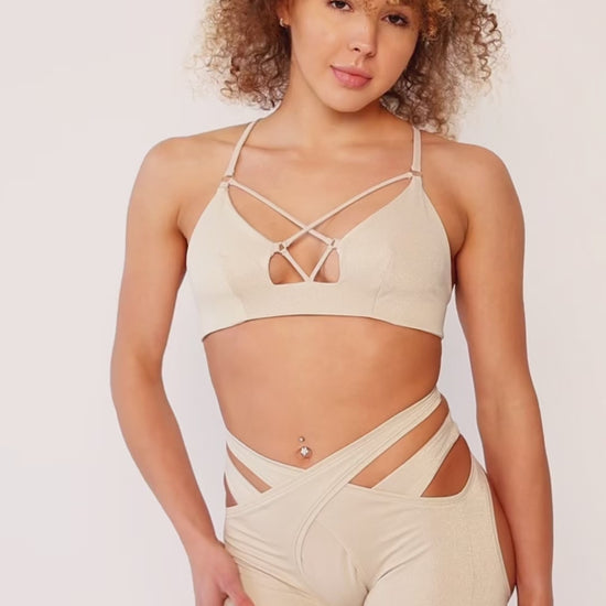 Feel everyday luxury. Champagne gold recycled polyamide glimmers with warm lurex threads like sunlight on skin. Lined with our signature buttery-soft nude-toned ECONYL® for cloud-like comfort.